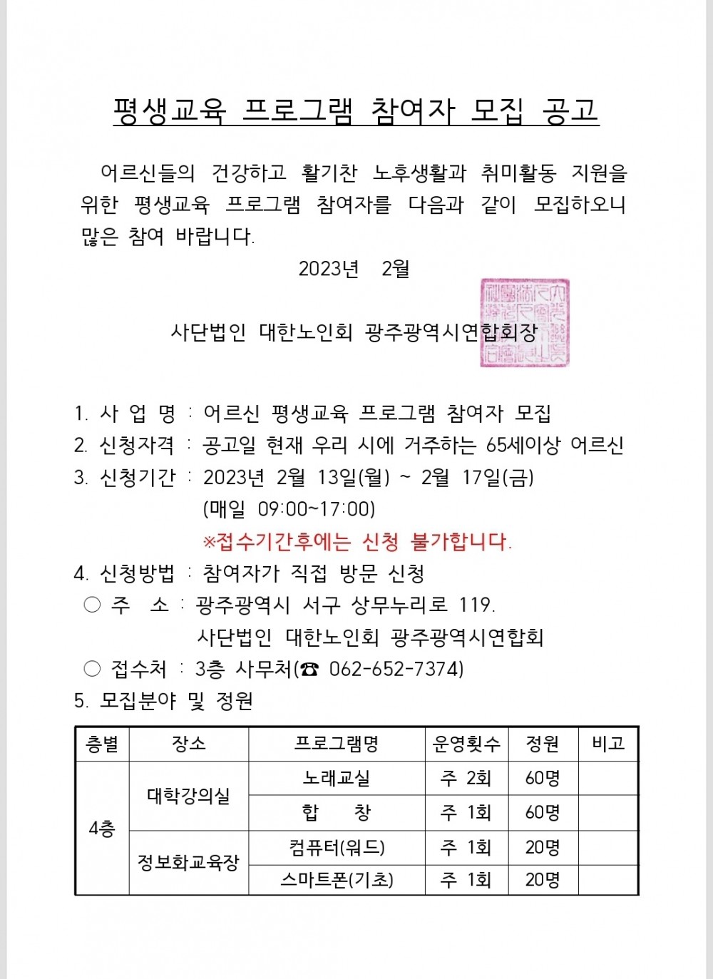 ○ 문 의 처 : (사)대한노인회 광주광역시연합회 (T.062-652-7374)