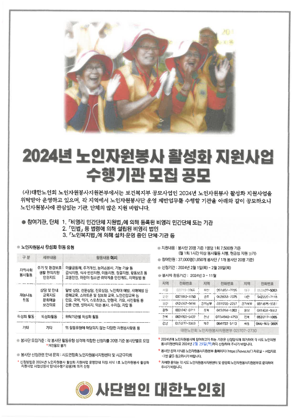 2024년 노인자원봉사 활성화 지원사업 수행기관 모집 공모